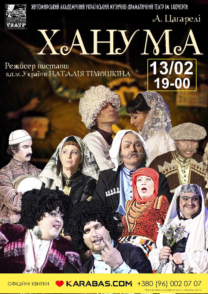 Ханума відбудеться 13 лютого 2021 о 19:00 в Житомир, Драматичний театр ім. І. Кочерги за адресою пл. Соборна, 6.